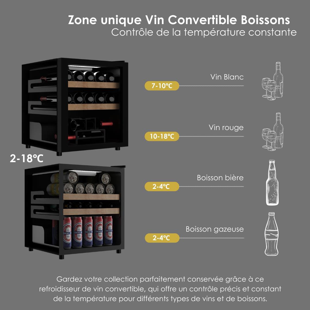 Polyvalence pour toutes les occasions : Profitez de la flexibilité de la fonction convertible vin & boissons, alternez facilement entre la préservation de vos vins et le rafraîchissement de vos boissons préférées, le tout dans un seul et élégant refroidisseur.